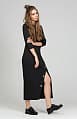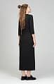 Платье «миди» прямого силуэта выполнено из плотного трикотажа «алези». На спинке средний шов и застежка на потайную молнию. Рукав узкий до локтя. На полочке не глубокий круглый вырез горловины и нагрудные вытачки. Оригинальность модели придает ассиметричная декоративная планка с металлическими пуговицами.